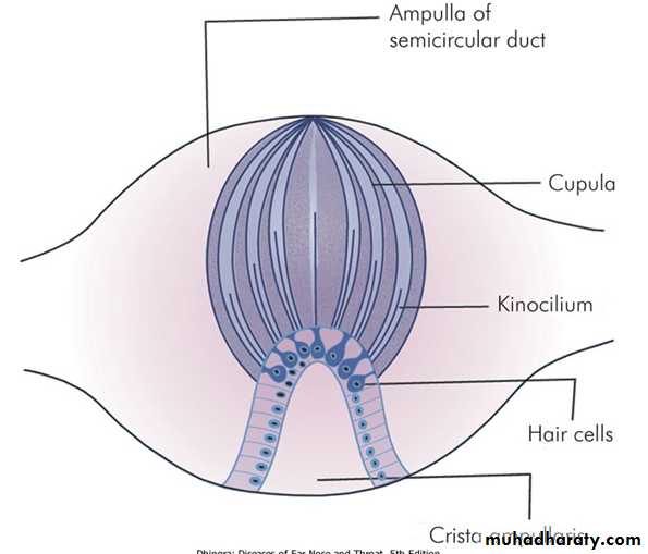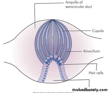 consists of the three SCC, the saccule and the utricle. They are fluid filled and have cells with cilia which bend as the fluid moves relative to them. This excites or depresses the nerve cells .