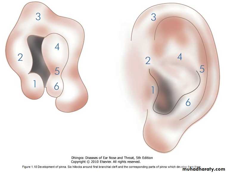 Around the sixth week of embryonic life, six tubercles from the first and second branchial arches ( hillocks of His) appear around the first branchial cleft. They progressively coalesce to form the auricle.
