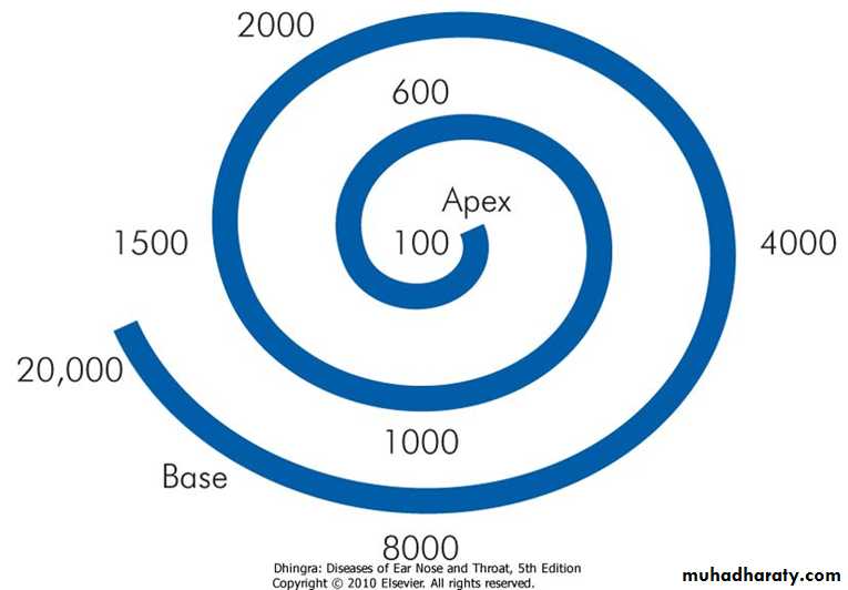 Frequency localisation in the cochlea. Higher frequencies are localised in the basal turn and then progressively decrease towards the apex.