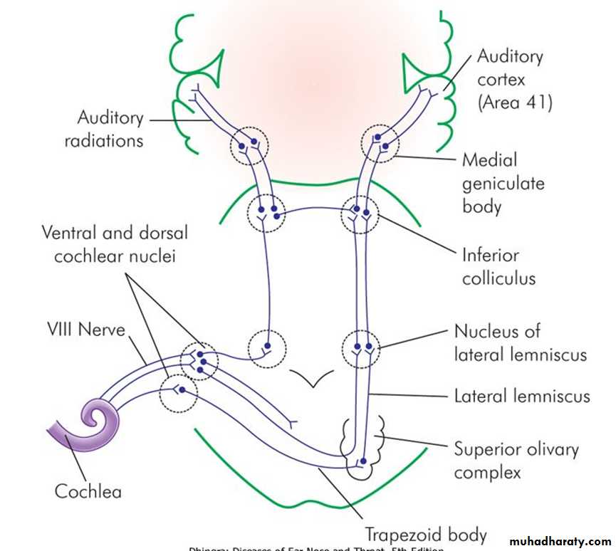 Hair cells get innervation from the bipolar cells of spiral ganglion. Central axons of these cells collect to form cochlear nerve which goes to cochlear nuclei. From there fibres travel to the superior olivary nucleus, lateral lemniscus, inferior colliculus, medial geniculate body and finally reach the auditory cortex of the temporal lobe.49