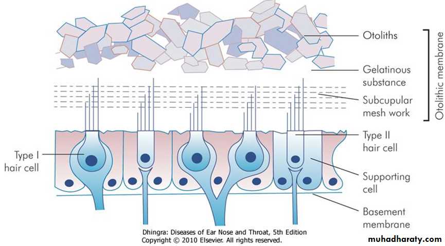 4. Tectorial membrane It consists of gelatinous matrix with delicate fibres. It overlies the organ of Corti. The shearing force between the hair cells and tectorial membrane produces the stimulus to hair cells