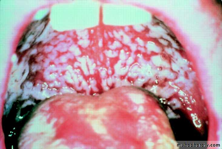 White coated tongue due to candidiasis occur when there is low immunity due to HIV , diabetes , malignancy , steroid use , prolonged antibiotic therapy .Should be differentiated from food sticking on the tongue !