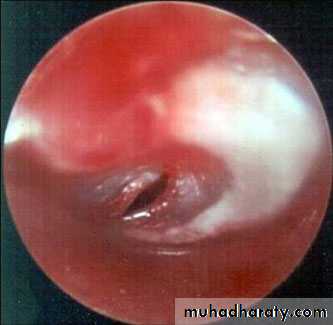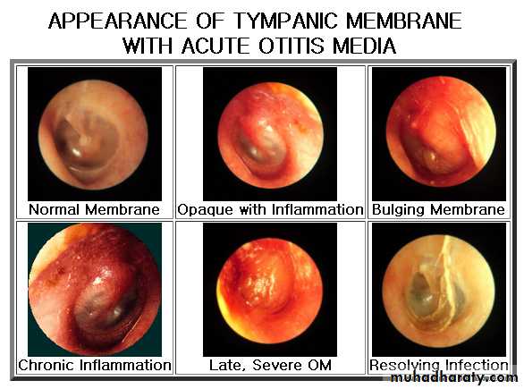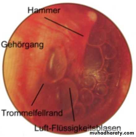 I. Otoscopy: Redness and injection of the TM and in severe cases there is outwards bulging of the TM with loss of surface anatomy. A mucopurulent discharge filling the EAM can be seen if perforation of the TM has occurred.