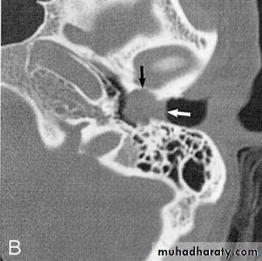 2. X-ray and CT scan of cholesteatoma appear as an area of translucency with a clearly outlined bony margin.