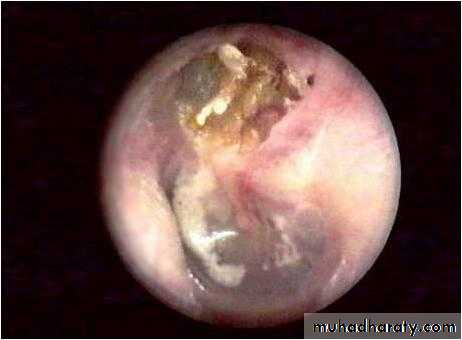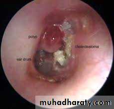 1. Otoscopy: Attic (unsafe perforation) situated in the pars flaccida. Cholesteatoma may be seen as a grayish substance projecting from attic perforations. Granulation tissue may be seen as well occupying such perforation.