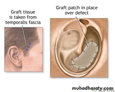 b. Myringoplasty +/- ossiculoplasty: Repair of the TM perforation +/-ossicles is indicated when there is recurring discharge or there is disabling deafness.