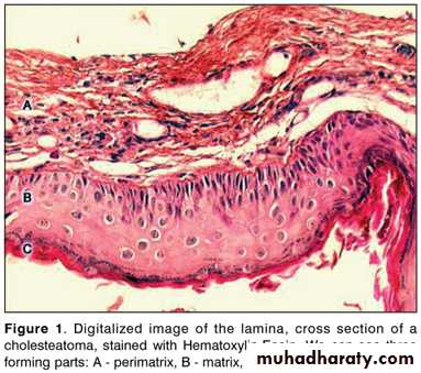 Cholesteatoma is a sacof keratinizing squamous epithelium containing keratinous debris and surrounded by granulation tissue. Otherwards, it is a skin in a wrong place.