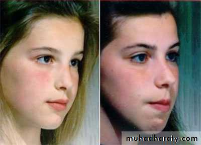 • Short upper lip.• Nose tipped superiorly