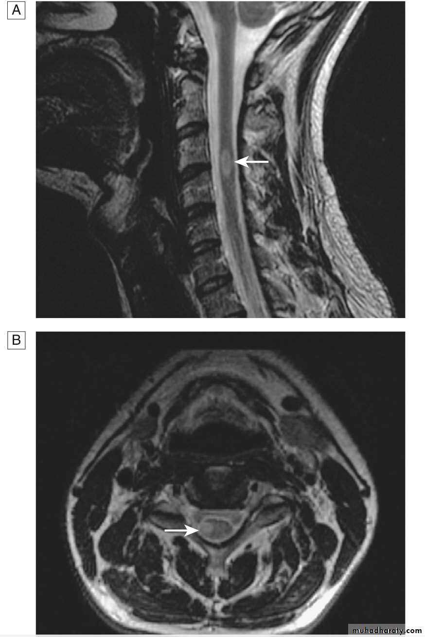 A T2-weighted MRI image of her spinal cord shows a lesion extending from T1 to T5 and affecting the central cord. The lesion shows patchy enhancement with gadolinium.