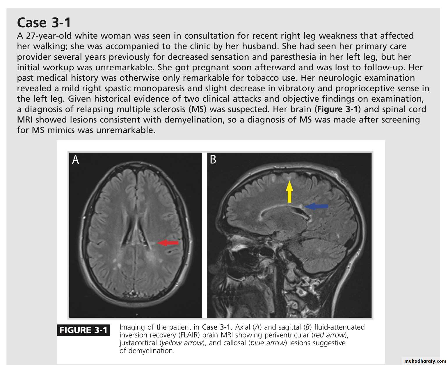 Multiple sclerosis (MS) is a chronic disease characterized by inflammation, demyelination, gliosis (scarring), and neuronal loss;Lesions of MS typically occur at different times and in different CNS locations.