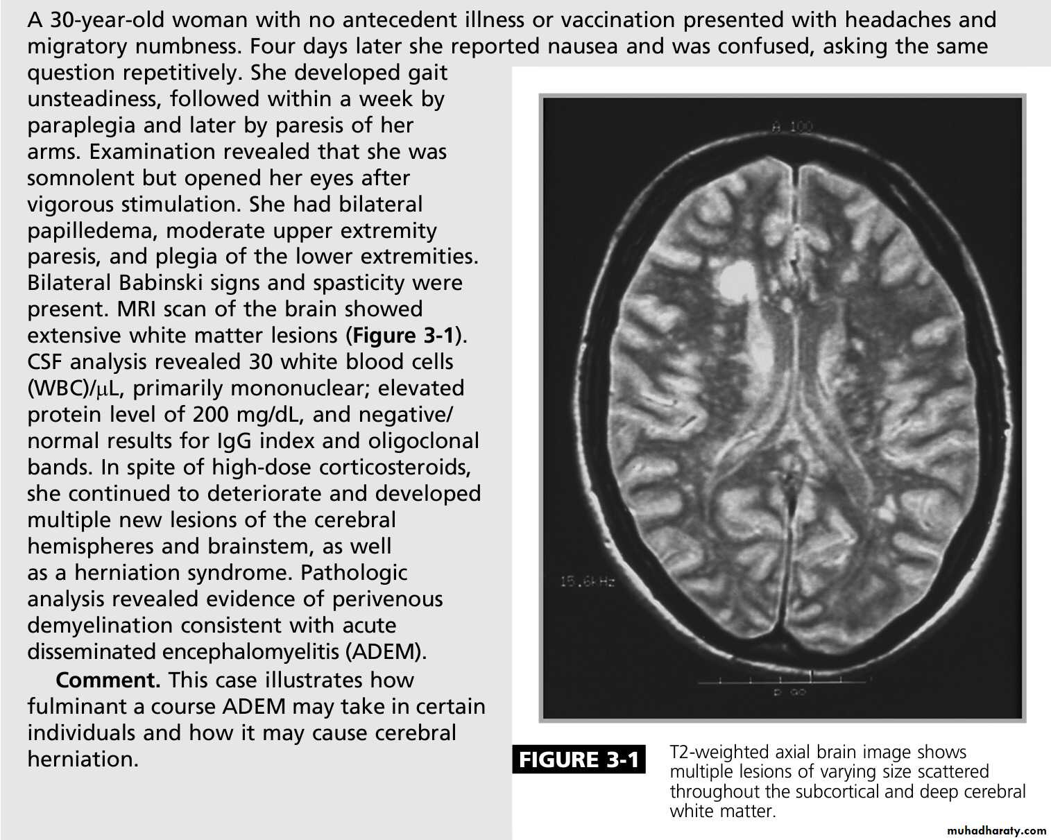 MRI shows multiple high-signal areas in a pattern similar to that of MS, although often with large confluent areas of abnormality. The CSF may be normal or show an increase in protein and lymphocytes (usually 200 cells/L) . The clinical picture may be very similar to a first relapse of MS.
