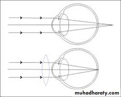 Hyperopia (Farsightedness): Due to either an eyeball that is too short or, occasionally, a lens system that is too weak. In this condition, by the relaxed ciliary muscle parallel light rays are focused behind the retina. By using the mechanism of accommodation, a farsighted person is capable of seeing distant objects clearly (i.e the ciliary muscle must contract to increase the refractive power of the lens).