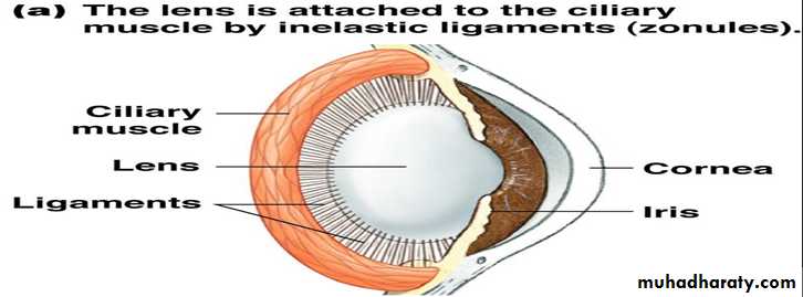 In a young person, the lens is composed of a strong elastic capsule filled with proteinaceous, but transparent fluid. About 70 ligaments attach radially around the lens, pulling the lens edges. At the attachments of the lens ligaments to the eyeball is the ciliary muscle.