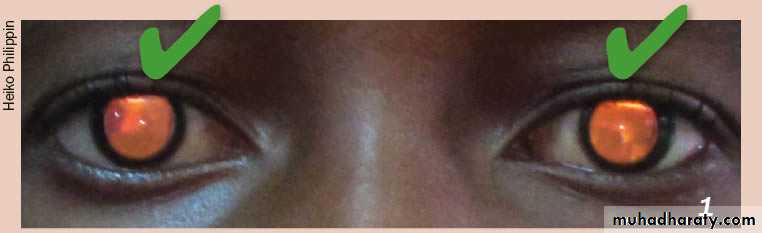 The red reflex: refers to the reddish-orange reflection of light from the eye's retina that is observed when using an ophthalmoscope or retinoscope from approximately 30 cm / 1 foot. This examination is usually performed in a dimly lit or dark room.