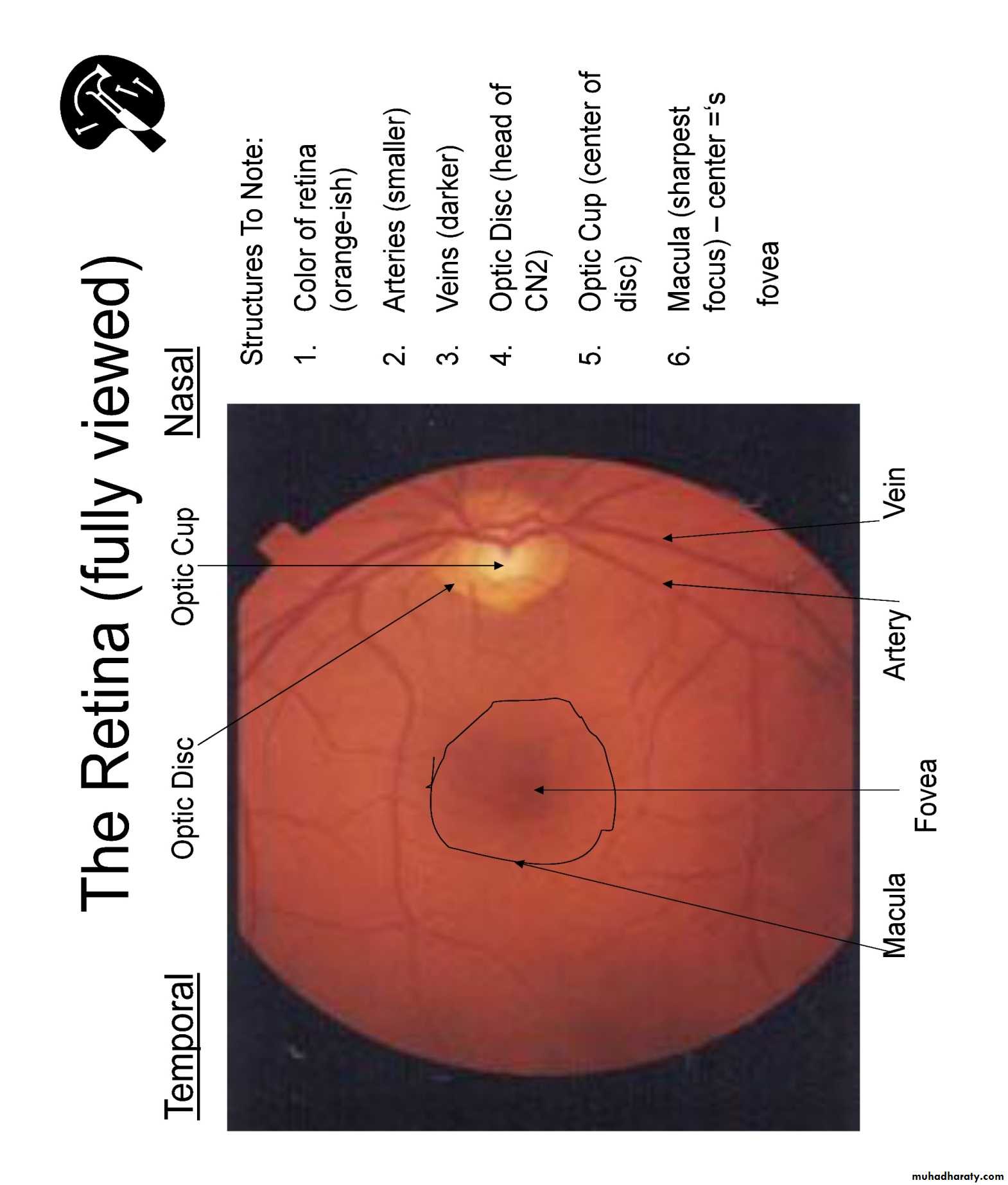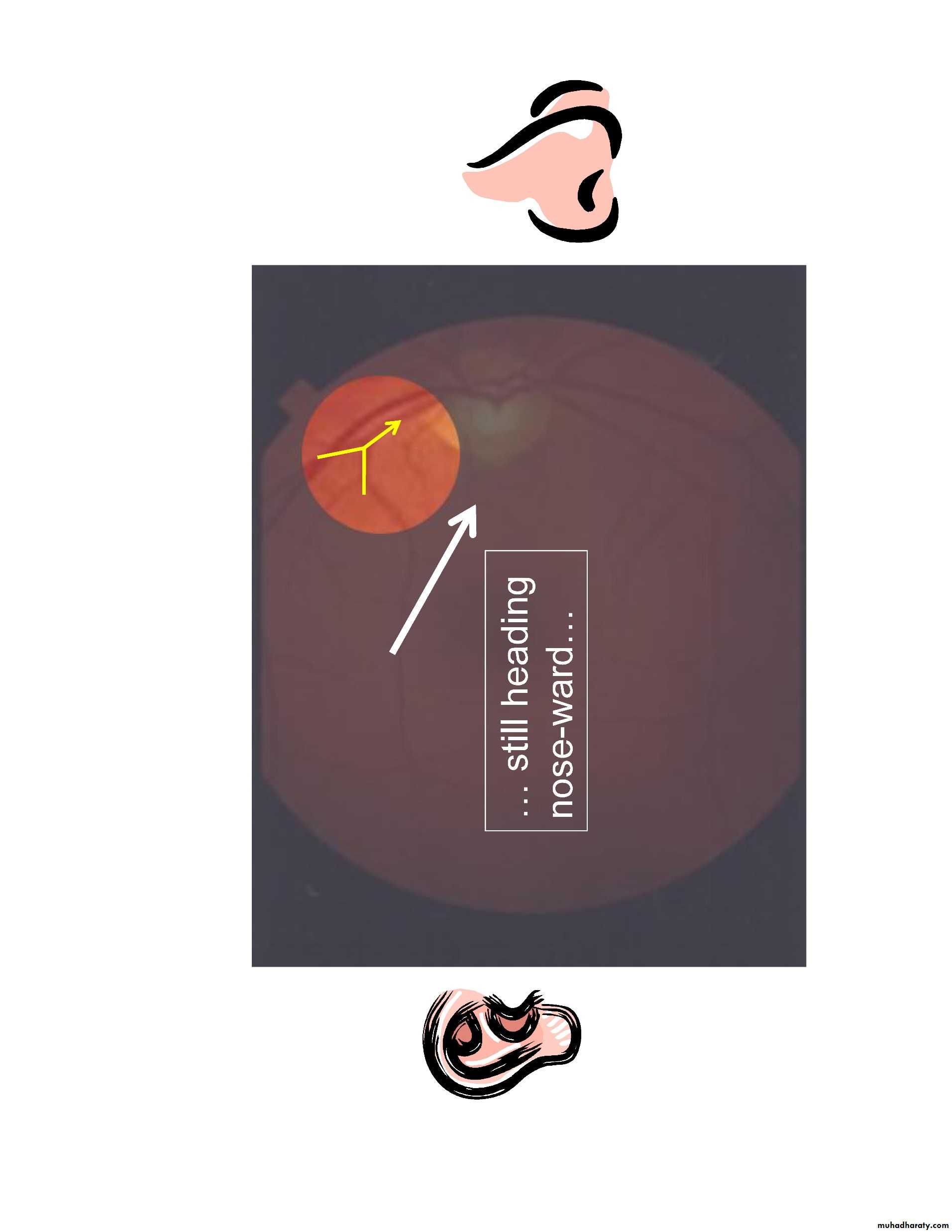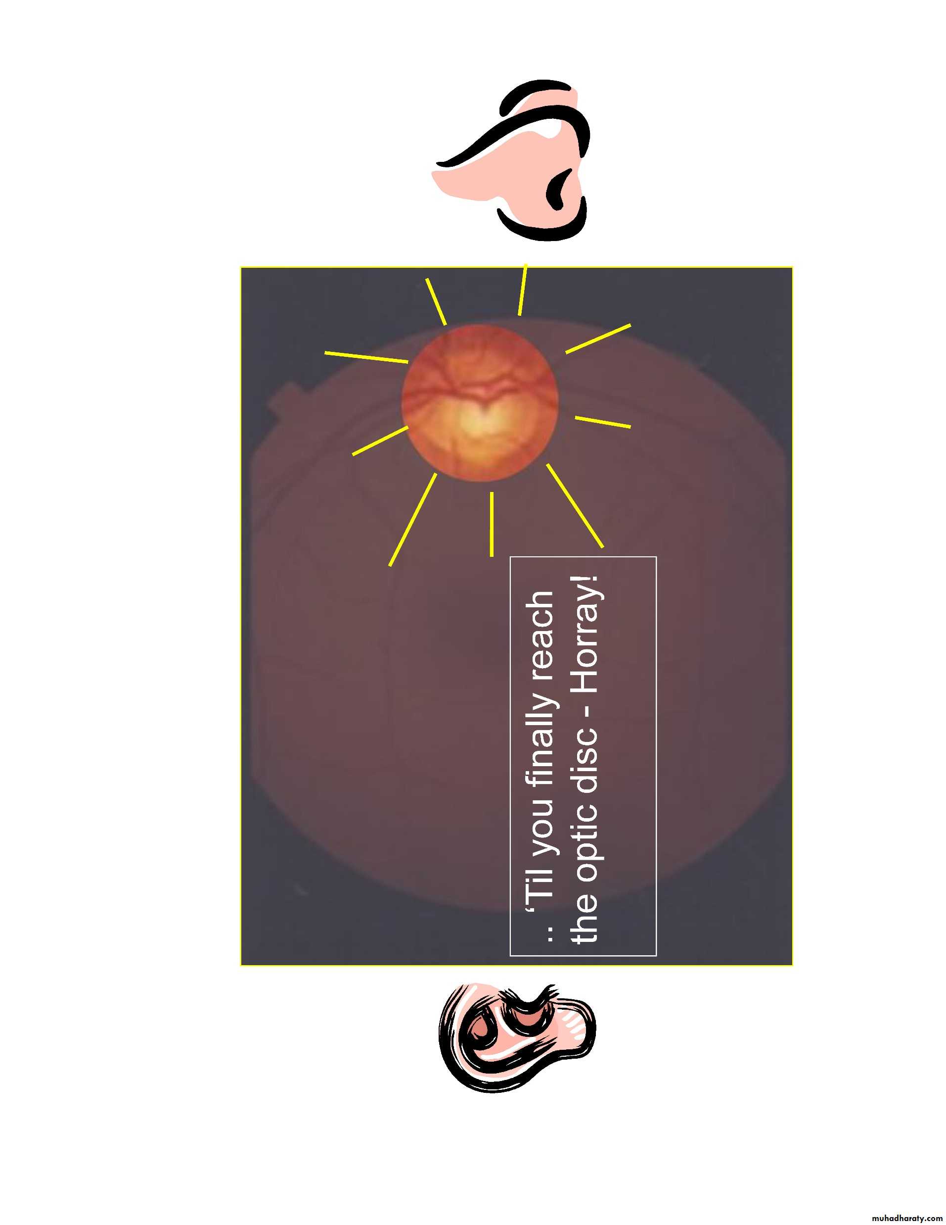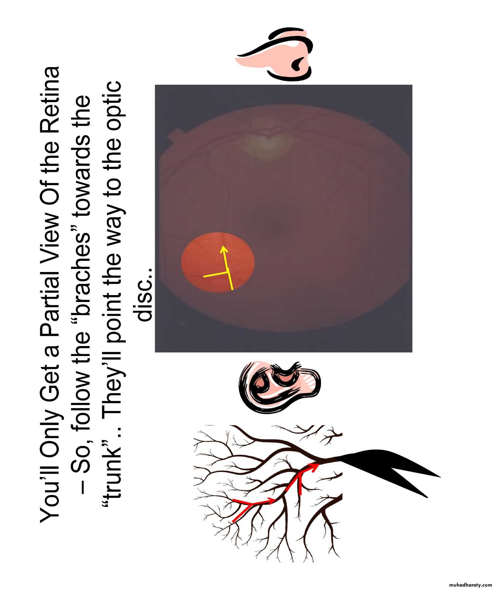 •at any time, only 15% of retina visible( without pupillary dilatation) while with pupillary dilatation about 50% of the fundus is visualized•Follow vessels (branches of tree trunk) optic disc
