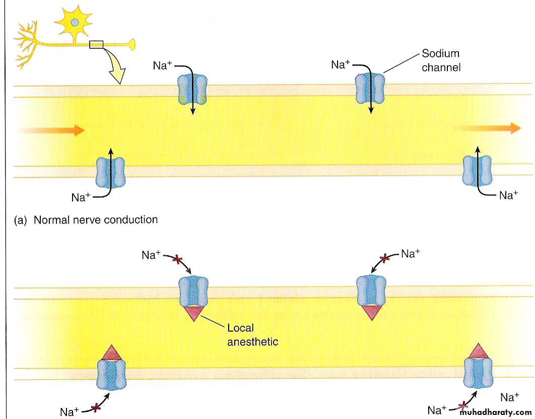 Local anesthetics reversibly bind to voltage-gated sodium channels, blocking Na+ movement through the channels, and thus block the action potential and neural conduction.At adequate dosage, these drugs should reversibly inhibit conduction of all neurons. Both pharmacological effects and most toxic effects of local anesthetics arise from this mechanism.