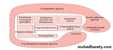 subcortical structures includes hypothalamus, the septum, the araolfactory area, the anterior nucleus of the thalamus, portions of the basal ganglia, the hippocampus, and the amygdala.limbic cortex surrounding the subcortical limbic structures it is composed of a ring of cerebral cortex in each side of the brain (1) beginning in the orbitofrontal area is the portion over the orbits , (2) extending upward into the subcallosal gyrus, (3) then in the cingulate gyrus, and finally (4) to the parahippocampal gyrus and uncus.