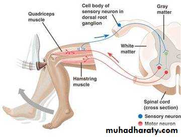 1-Stretch reflexes e.g . knee jerk, ankle jerk , biceps jerk, triceps jerk .These reflexes are elicited by tapping briskly on a tendon which suddenly stretchs a muscle, resulting in its contraction . The muscle being tested must be relaxed and the same stimulus intensity should be applied to both sides. The response will be in the form of contraction of the stretched muscle that will eventually produces movement of the attached limb .2-Superficial reflexes.e.g plantar reflex .Assessment of the plantar (the babinski response) is of great clinical importance.