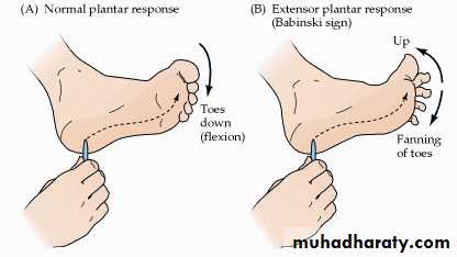 a-flexor plantar response: i.e Babinski sign negative.In the healty adult response plantar flexion and adduction of toes particullarly of the big toe. (Fig.2)