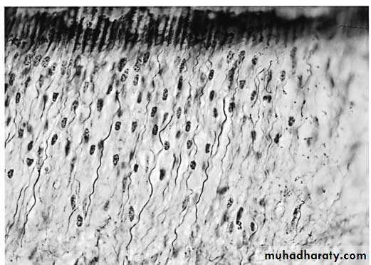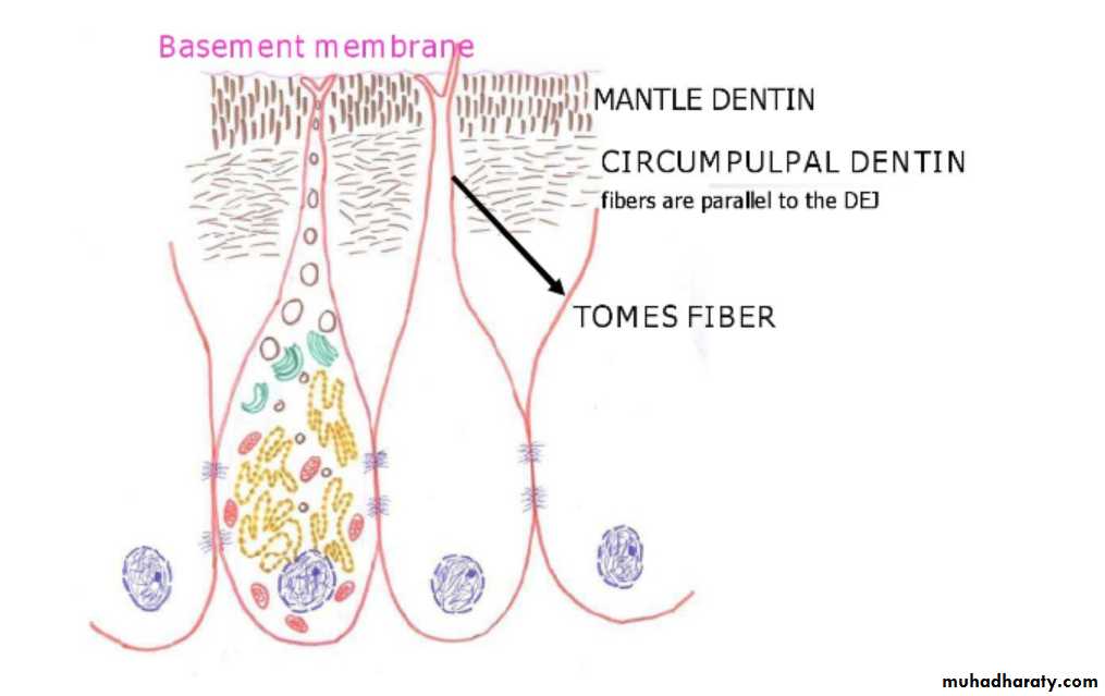 Korff's fibers (corkscrew fibers) passing between odontoblasts and reach predentin.