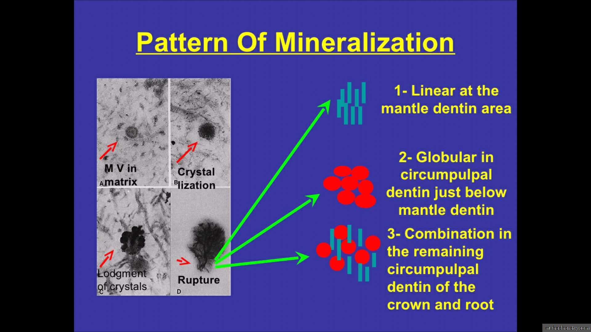 1- First dentin mineralization starts by matrix vesicles then the mineralization process continued by deposition of apatite crystals around and within collagen fibrils.2- Basically mineralization occurs by globular or calcospheric calcification, which involves the deposition of crystal in several discrete areas of matrix with continued crystal growth globular masses are formed that continue to enlarge and fuse to form a single calcified mass