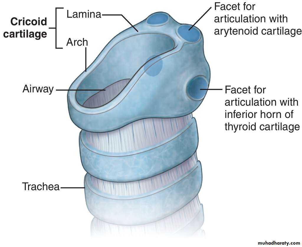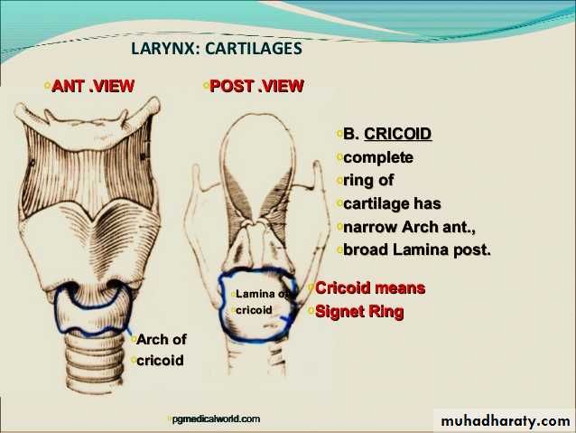 like signet ring .It is the only complete ring of cartilage in the walls of respiratory system.
