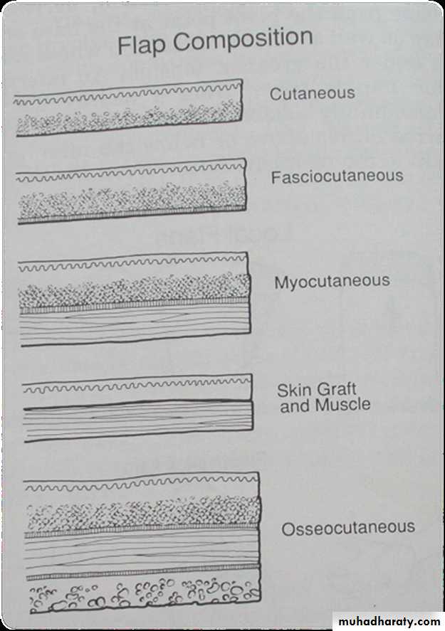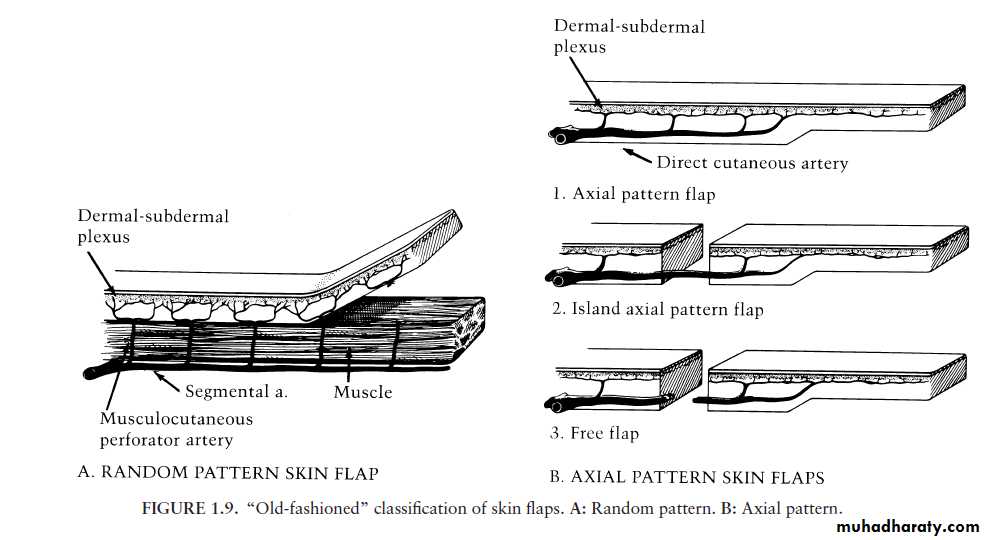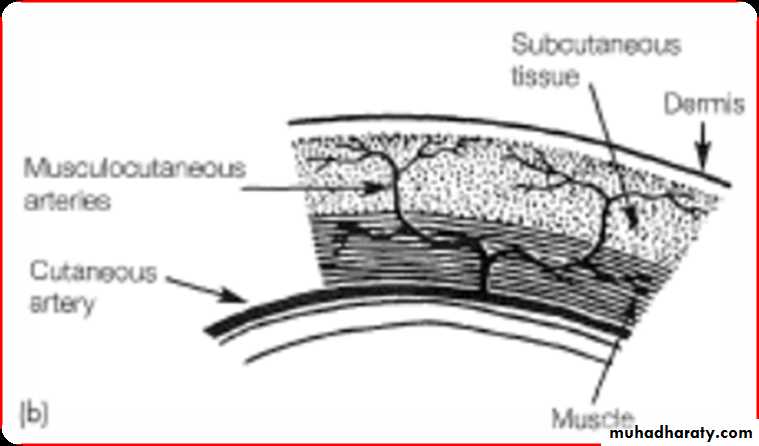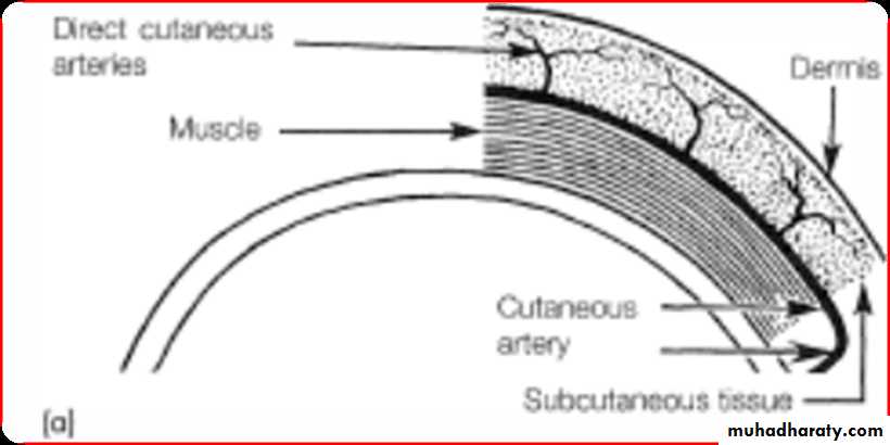 • Pedicle flaps are supplied by large named arteries that supply the skin paddle through muscular perforating vessels.