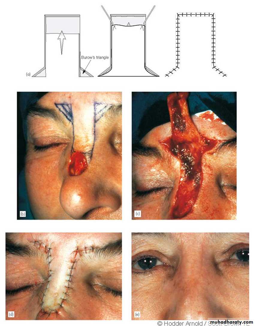 A, Advancement flap for closure of forehead defect. B, Closure of defect with incision lines placed in natural forehead crease