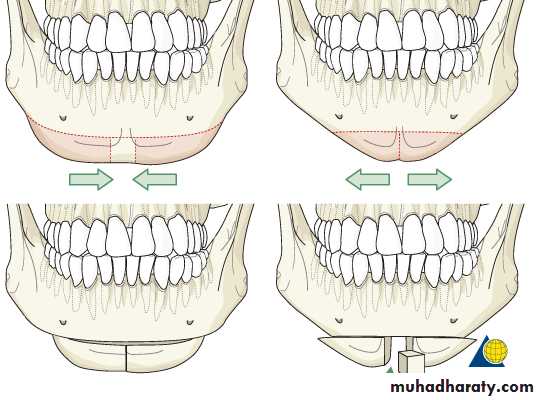For transverse genial deformities, vertical osteotomies/ostectomies can also be performed.This allows widening or narrowing of the chin. In case of widening, additional bone grafts or alloplastic implants (eg, ceramic blocks) are needed.