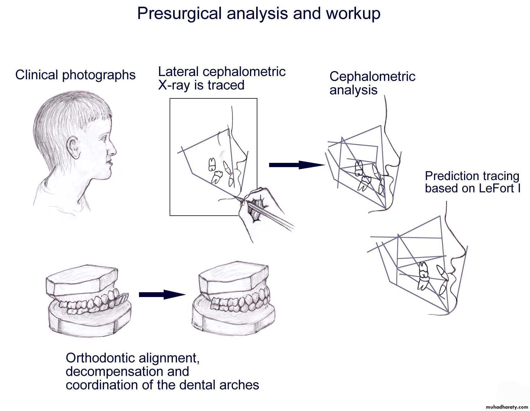 Surgical movement of maxilla and mandible inherently alter the maxillary-mandibular dental occlusion, and as such, careful analysis of the dental models with the orthodontist is essential. The maxillary dental and mandibular dental casts can be studied individually and hand manipulated with each other to assess how the arches are coordinated.Assessment of the models includes space analysis and arch length, transverse width discrepancies, position of the individual tooth within its own arch, and the relationship of the maxillary dentition to the mandibular dentition.