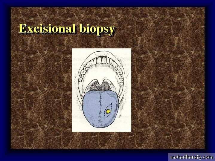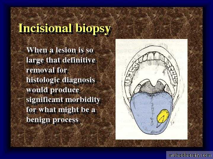 b) Area of surgical removal:• Incisional biopsy: consists of the removal of a representative sample of the lesion and normal adjacent tissue in order to make a definitive diagnosis before treatment.
