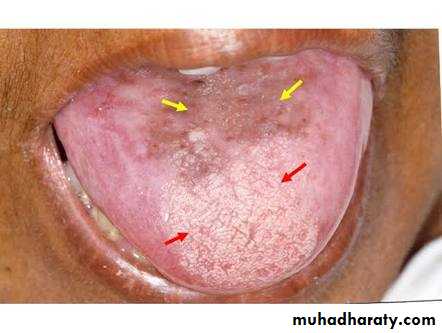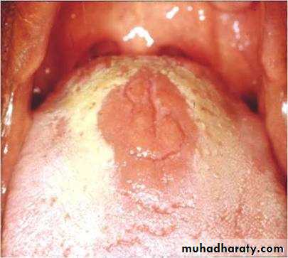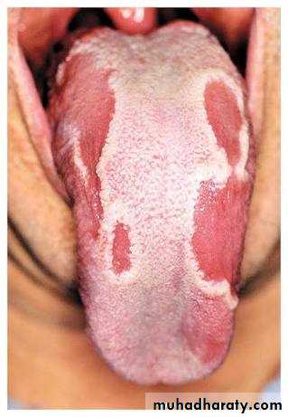• Clinically present multiple, irregular, well demarcated, smooth partly erythematous areas on the dorsum of the tongue with desquamation of filliform papillae