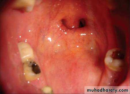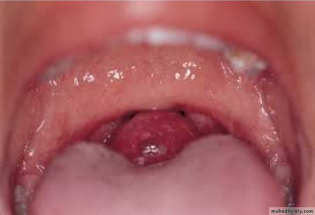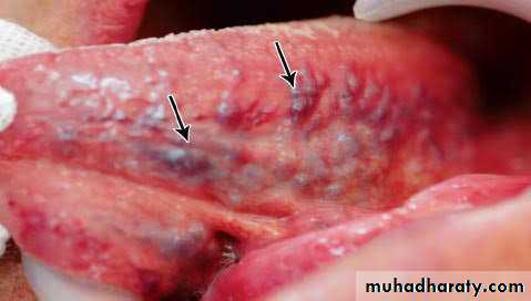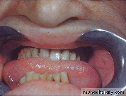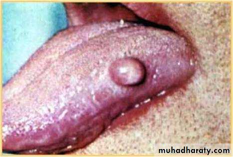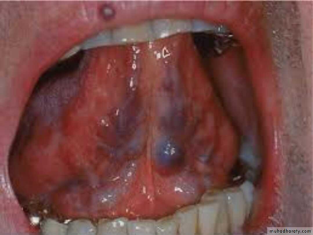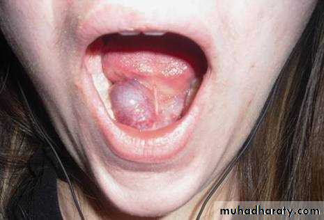 • Clinically appears small round, purplish nodule, lateral to the sublingual vein which is usually also deflected