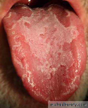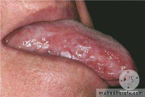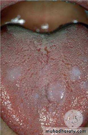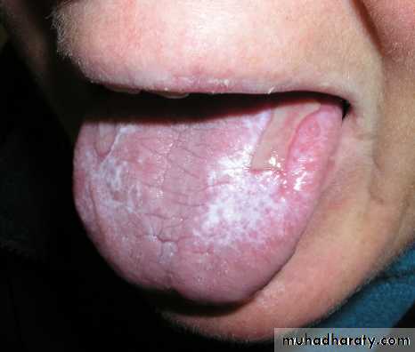 • Sign:- affected areas of tongue shows milky-white patches with cracked fissures