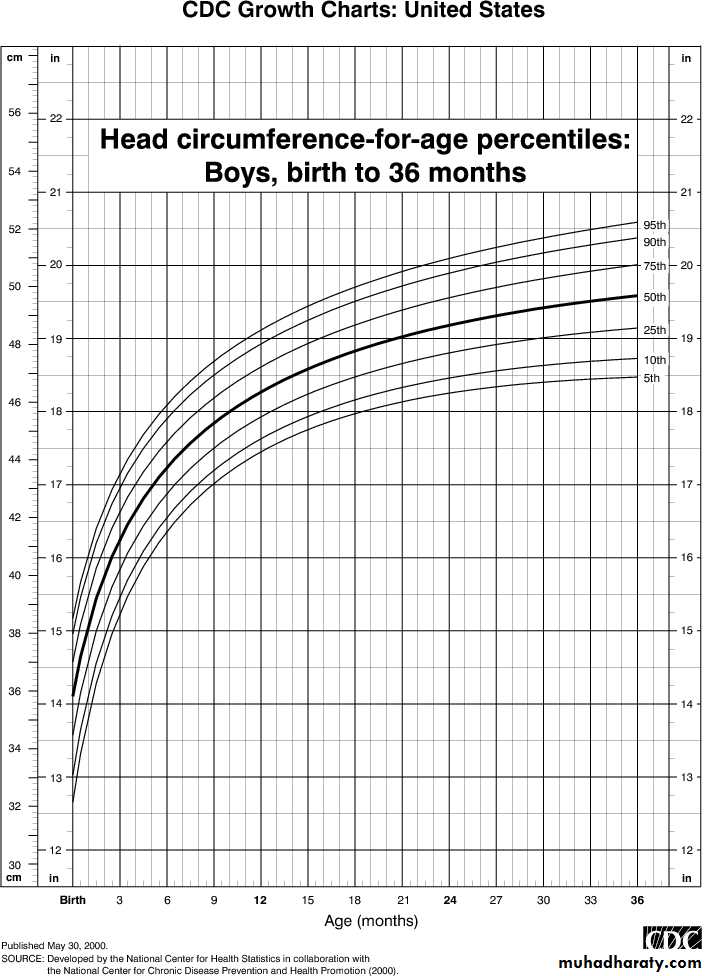 The head circumference at birth is 35 cm, it increases to 40 cm by 3 months,43 cm by 6 months, 45 cm by 9 months, 47 cm by one year, 49 cm by two years and 50 cm by 3 years. The approximate increase is 2.0 cm/month is the first 3 months, 1 cm/month in the next 3 months and 0.5 cm/month in the next 6 months.