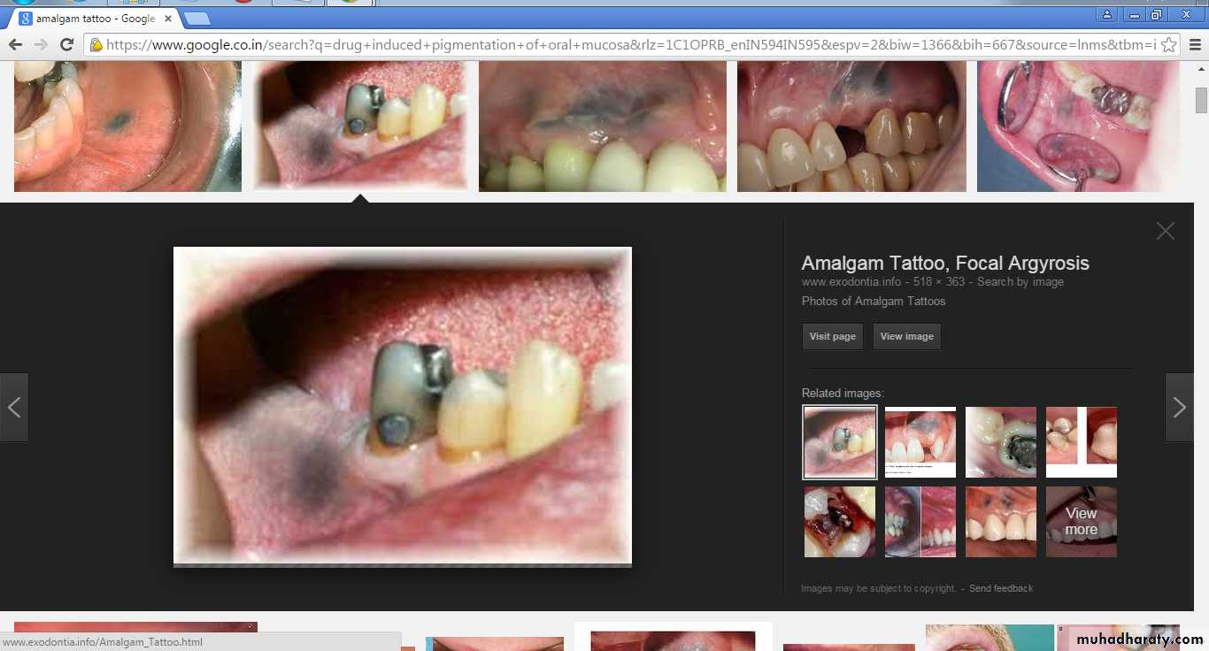 Amalgam tattoos are painless, gray-blue macules that range in size from a few millimeters to greater than 1 cm.The gingiva and alveolar mucosa are the most common sites of involvement
