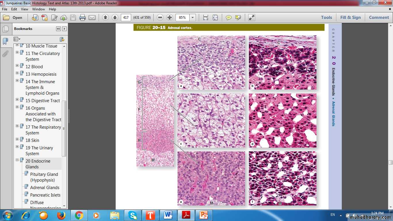 Zona Glomerulosa (15%): rounded or arched cords of columnar or pyramidal cellsZona Fasciculata (65-80%): long cords of large polyhedral cells, one or two cells thick
