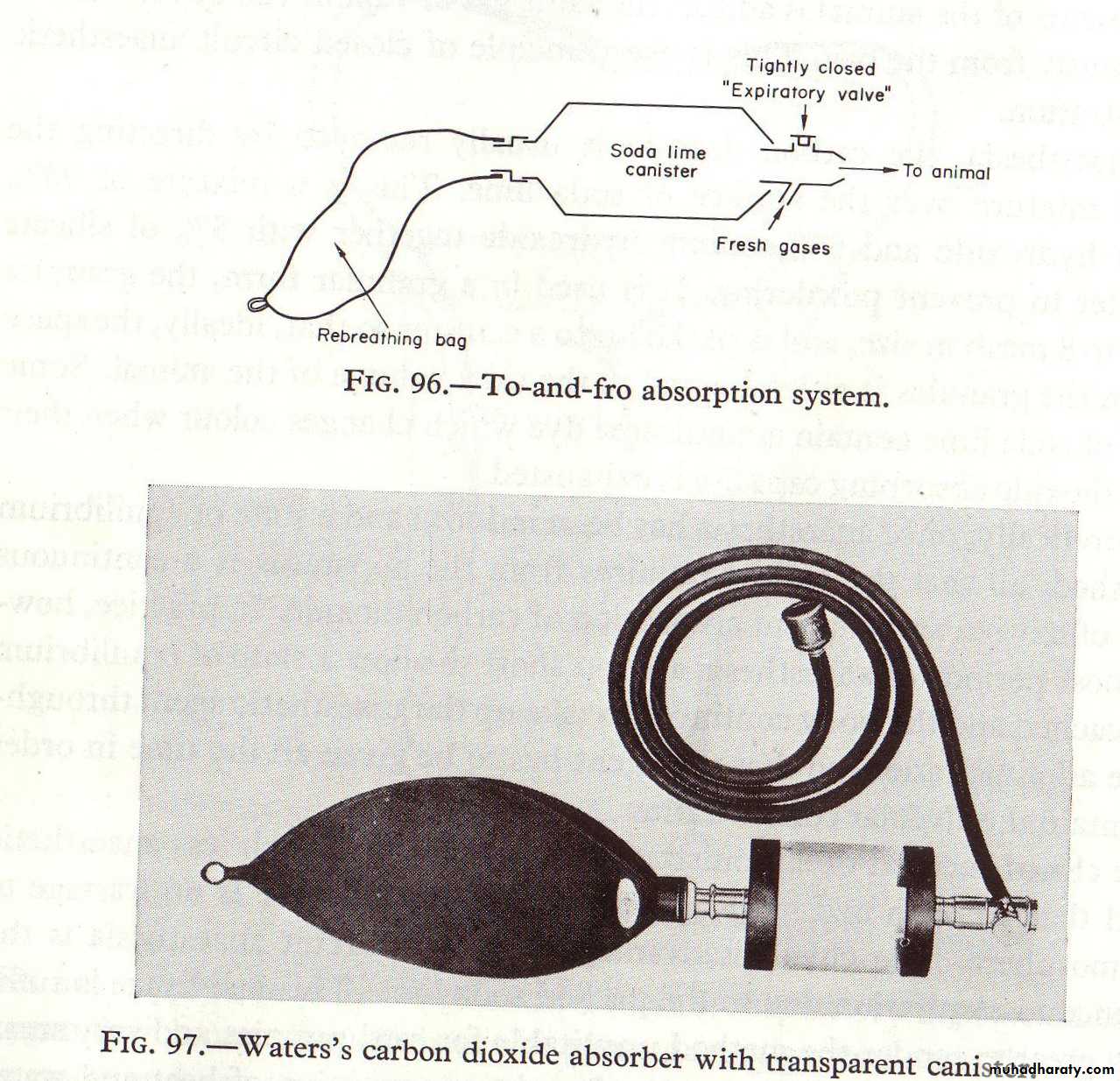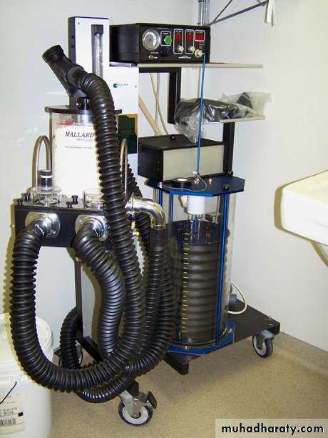 A canister full of soda lime is interposed between the animal and the rebreathing bag, fresh gases being fed into the system as close to the animal as possible to effect changes in the mixture rapidly. This system is simple and efficient but has a few drawbacks. It is difficult to maintain the heavy, akward apparatus in a gas tight condition and the inspired gases become undesirably hot due to the chemical action between the soda lime and the carbon dioxide. Furthermore,’ irritating dust may be inhaled from the soda lime and give rise to a bronchitis. Nevertheless the system is the one most used in veterinary anesthesia (inexpensive).Lectures in Veterinary Anesthesia