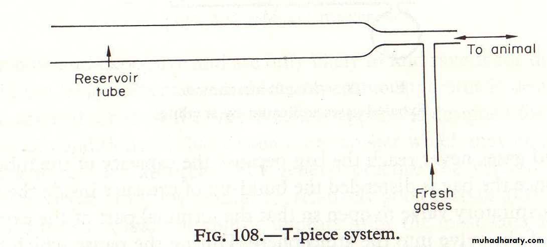 The low resistance and small dead-space make the T-piece system very suitable for use with cats and small dogs.An open tube acts as a reservoir and there are no valves. The exhaled gases are swept out of the open end of the reservoir tube by fresh gases flowing in from the anesthetic apparatus during the expiratory phase.