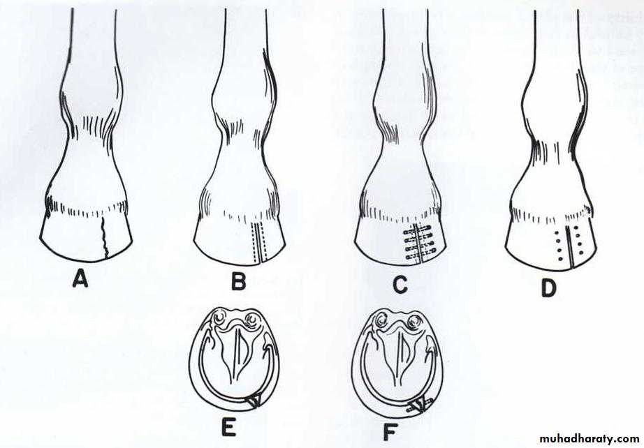 Another treatment for the wall cracks is by drilling in the sides of the crack to form many holes on either side of the crack, then thread the holes by umbilical cotton tape or stainless steel wire.Any wall cracks can be treated by use of special materials to fill the crack like Epoxy glues, Fiber glass or special hoof- repair material in combination with the first treatment.