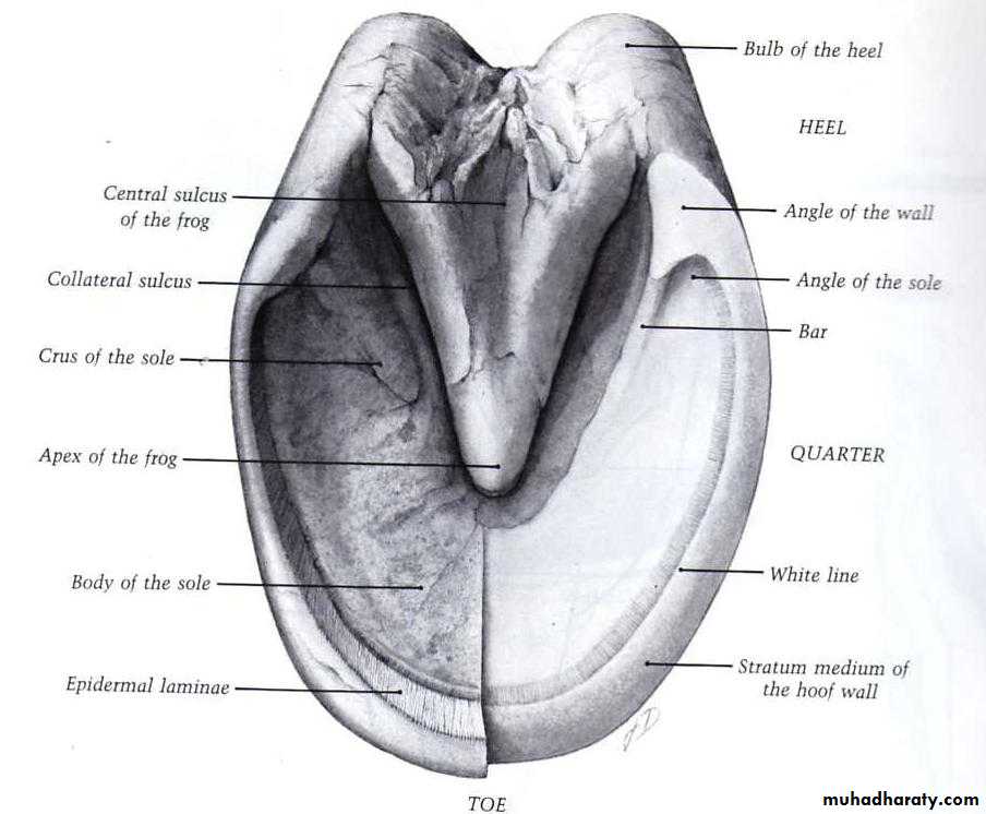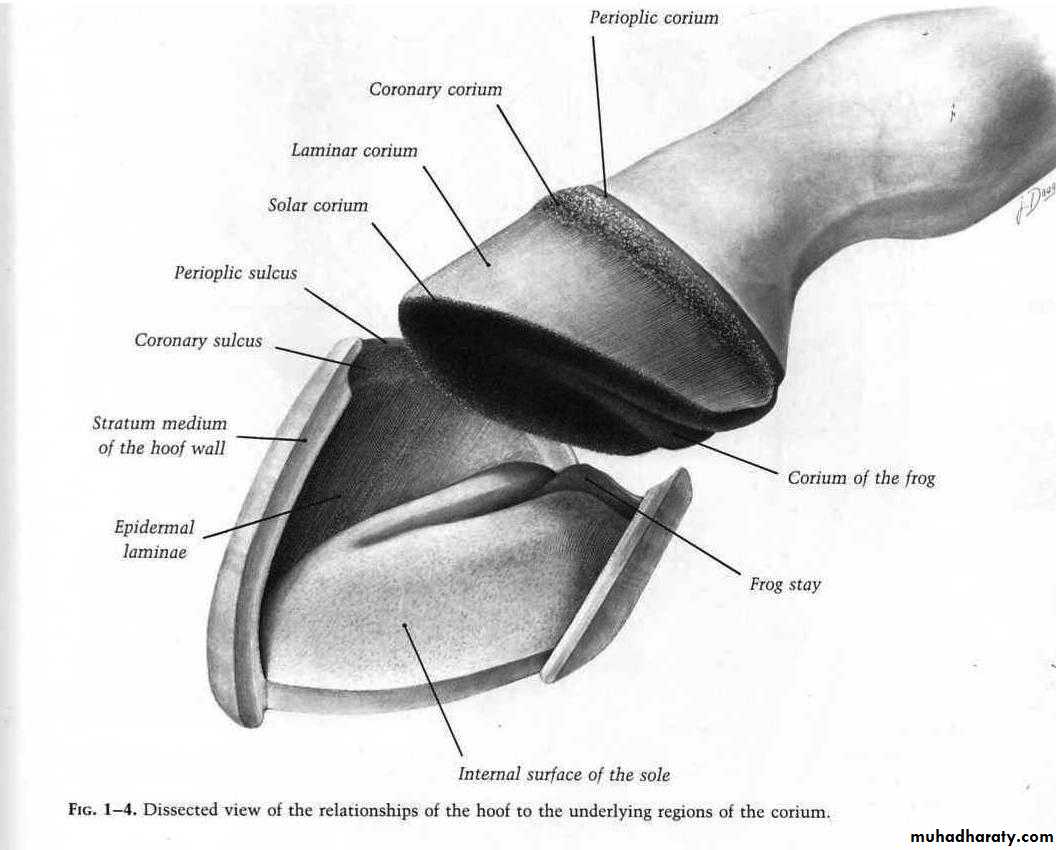 The foot consists of the epidermal hoof and all encloses, and the connective tissue corium which is derived from the dermis of the coronary band.The hoof includes the following tissues:-
