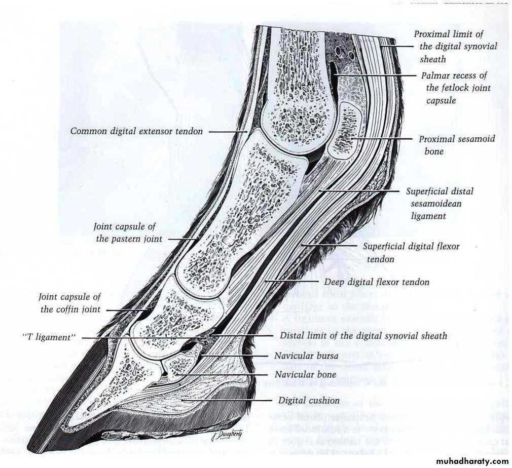 several ligaments, tendons of insertion of the common digital extensor and deep digital flexor muscles