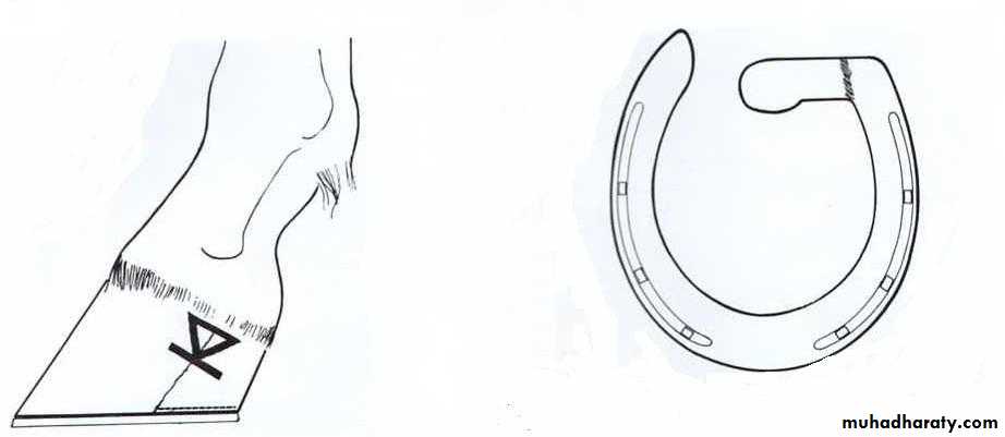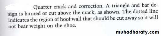 The bearing surface of the hoof wall should be lowered in back of the crack.A half bar shoe should be applied, with the bar on the heel of the affected side and this bar should press against the frog, so it will make frog to bear the weight that normally would be taken by the hoof wall.