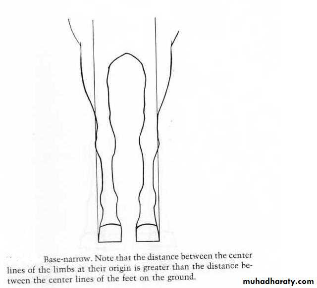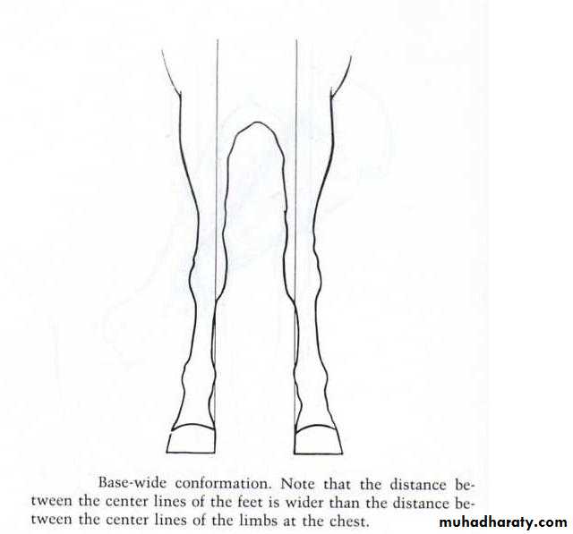 Base narrow:- In base narrow conformation , the distance between the center lines of the feet at their placement on the ground is less than the distance between the center line of the limbs at their origin in the chest when viewed from the front. This is found most often in horses having large chest and well developed pectoral muscles, such as quarter horses.Base wide:- The distance between the center lines of the feet is wider than the distance between the center lines of the limbs at the chest.