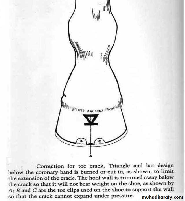 The hoof wall on the bearing surface should be lowered about 1 inch on either side of the crack, this will aids in preventing expansion of the crack.If the crack does not extend into the coronary band, a pattern of a triangle and bar design is grooved or burned below the coronary band, this will limit the crack to progress upward.