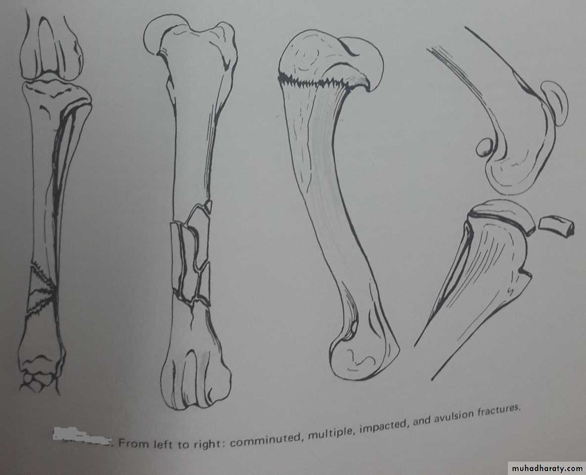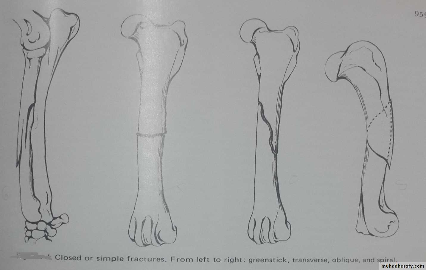 1- Greenstick fracture: with this fracture the bone is partially broken and bent. These fractures occur primarily in young animals whose bones are resilient. Displacement is minimal and healing is rapid.2- Transverse fracture: The bone is broken at a right angle to its long axis. After the fragments are apposed normal length of the bone is usually achieved.