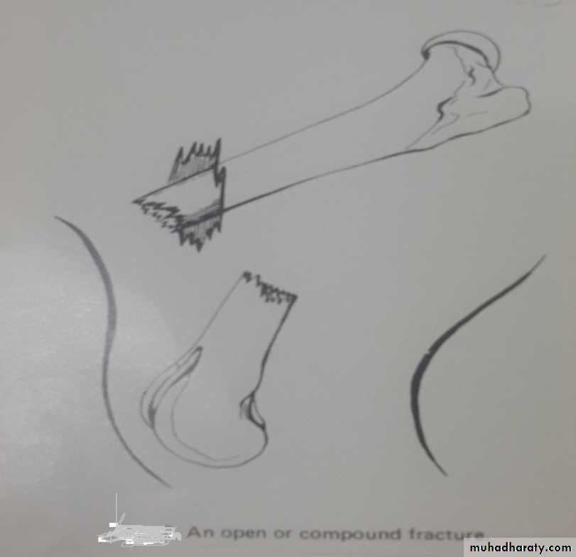 2- open and closed fractures:- A fracture is closed or simple when there is no communication between the fractured bone and the exterior of the body. It is classified as open or compound when there is an opening through the skin and underlying soft tissues leading to the fracture. Open fractures are subject to contamination or infection.