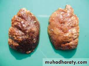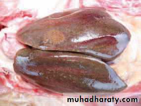 The liver is enlarged, bronzy color (hemosiderosis) and show necrotic foci (typhoid)