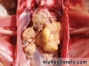 Chronic cases: Pale yellow nodulesin myocardium, intestine and gizzard.