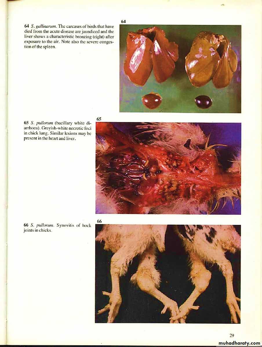 Birds hatched from S.pullorum or S. gallinarum infected eggs appear moribund or dead in the hatching trays and the young birds will show weakness, depressed appetite, poor growth and increased mortality.In older birds depression, diarrhea, ruffled feathers, pale shrunken combs and drop in egg production and increased mortality will be observed. Morbidity and mortality can be highly variable (mortality can reach 25-60%)